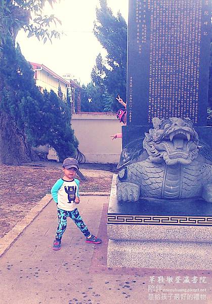 來書院參觀還很不正經的安妮與佐弟(出門前還跟我說要「穿拖鞋」)。碑記下方的就是龍龜(正名為贔屭)。