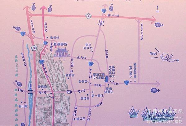 這是怎麼到登瀛書院的地圖,當中也標注了一些草屯的景點,像是:碧山巖、台灣工藝文化園區、寶島時代村,另外未在地圖上的九九峰,都是朋友們到草屯旅遊可以安排的景點喔!對了,如果孩子很喜歡上圖書館,可以到草屯圖書館(Link!),裡面有不少的0歲以上的童書繪本喔!