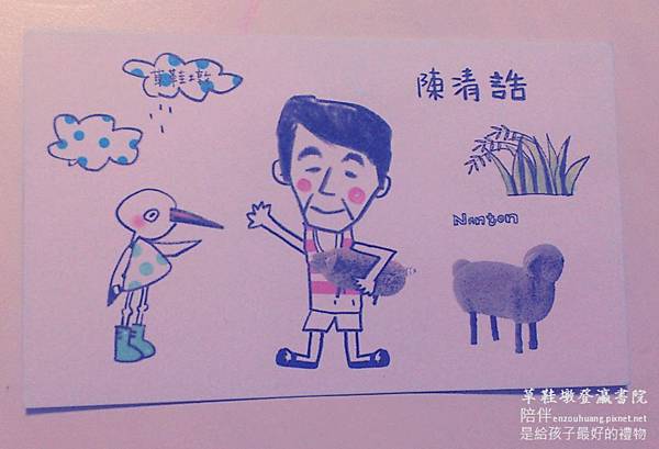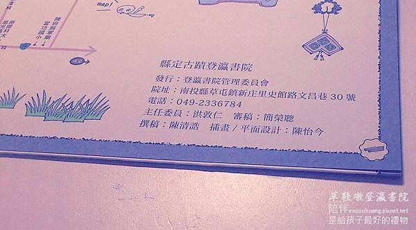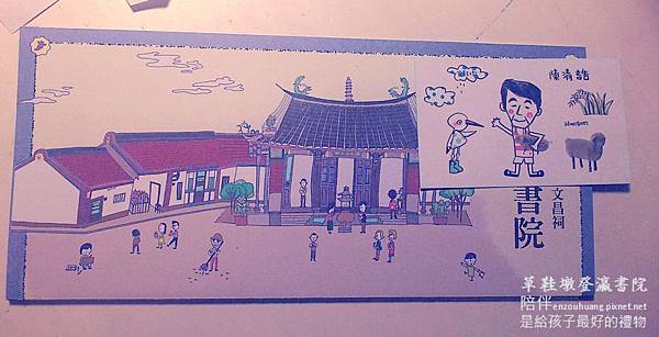 交流之後,陳老師拿了幾份介紹登瀛書院的簡介,他說:「這一份書院介紹的文字是他寫的,圖畫呢...」我非常瞭解,一個作為父親的心態,他接下來一定會說:「這圖是我女兒畫的!」果真沒錯,陳老師倒是驚訝我怎麼會知道,哈哈~我有讀心術啊!