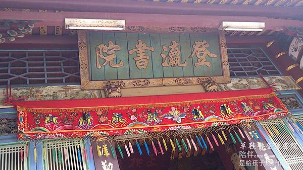 院名匾掛於正殿門楣上方,為清道光28年(西元1848年)登瀛書院落成時所掛,院名典出《唐書》,唐太宗「十八學士登瀛州」的故事。(文:陳清誥)