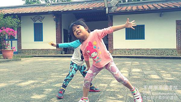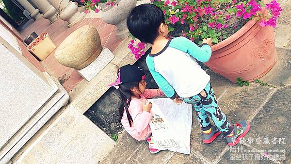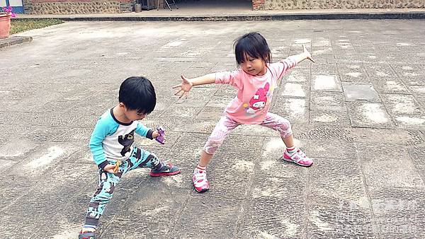 還好把霍爾與阿嬤陪安妮佐弟玩樂,我跟阿公認真聽陳老師講書,安妮與佐弟就在這個廣場上開心的奔跑,撿拾地上的落葉。那個腳張很開的動作據說是在「比大小」。