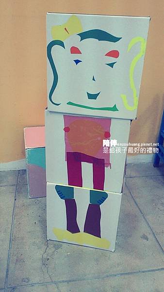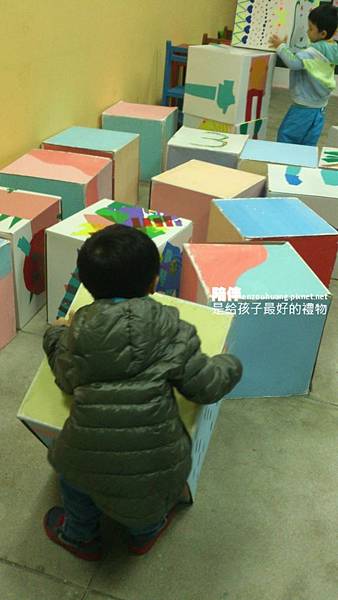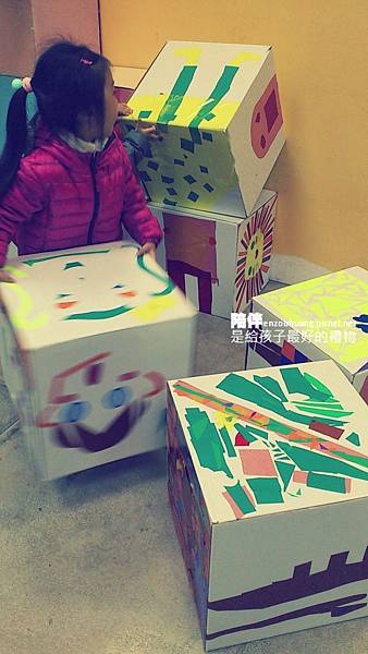 ▼下一個指令要到隔壁的教室執行。用這些大大的正方體箱子,堆疊出自己的模樣。