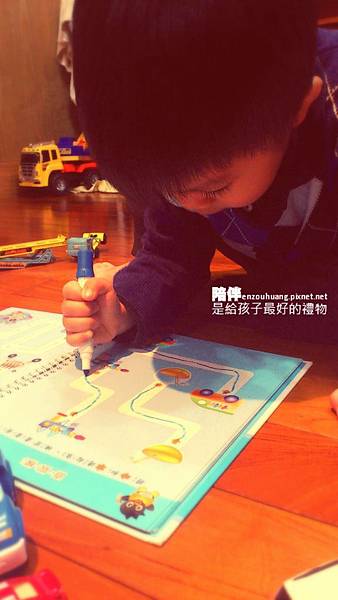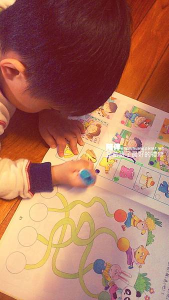 最近,我卻開始感受到佐弟的變化,除了睡前替自己爭取讓媽媽講「他自己選的故事書」,過去買給安妮的塗鴉書,常在不經意的時候吸引弟弟的目光,他開始認真地握著筆,聚精會神的連起了點對點,曾經以豪邁之姿揮灑於紙張的筆觸,似乎跟我們說再見了,當他聽完媽媽講述書本上的指令,幾乎零失誤的將對應的色彩,慢慢的一筆一畫將空白補滿,我完全感受到他那認真的態度,努力的不讓握在手裡的色筆超出框線以外(我從不規定孩子得把筆畫填在框線之內,以專業於兒童藝術工作者的建議,那只會扼殺孩子的藝術天分,但看著他有別於以往的專注態度,作為母親的我,選擇在一旁靜靜的欣賞、享受這種短暫的寧靜時光)。