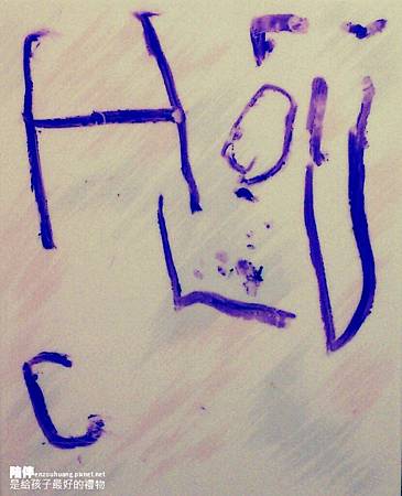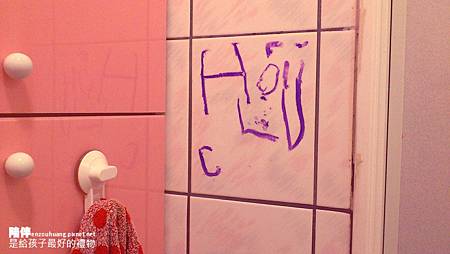 想不到,這聲東擊西的伎倆奏效,兒子恢復沉著的態度,跟著我到浴室,從那八個顏色的洗澡蠟筆中選了一隻紫色的,在靠近門邊的長方形磁磚上畫上了很端正的L,我看他毛有些順了,就繼續鼓勵他把U也畫出來,接著出現在牆上的是幾個照鏡子的C(因為左右寫反了,但我從來都沒有想要更正他的意思),然後,A他不會寫,倒是寫成了沒有屋頂的H,我主動幫他把上頭連成一個尖角,想說「嗯~這樣就是Lucas的A了」,想不到,喚醒他不理智的情緒,再度吵著我要把H變回來,好吧!反正幹麻一定要當一個叛逆的父母啊!拿起一張衛生紙,馬上就為他把尖角擦掉,好啦!H終於回來了,我有籌碼跟佐弟繼續談下去了。