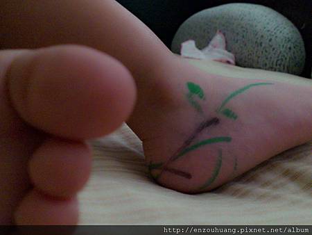 弟弟用彩色筆在腳上畫了的圖案,在媽媽的眼裡看來,好漂亮。